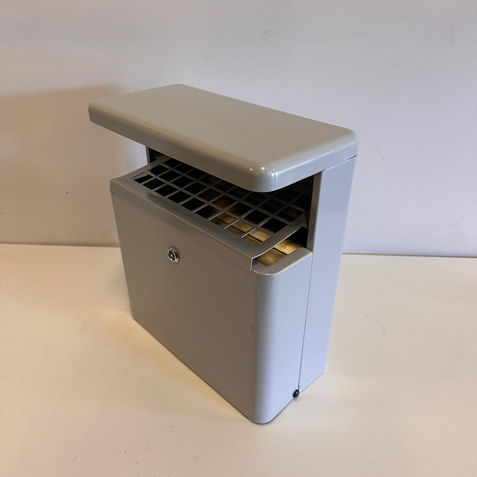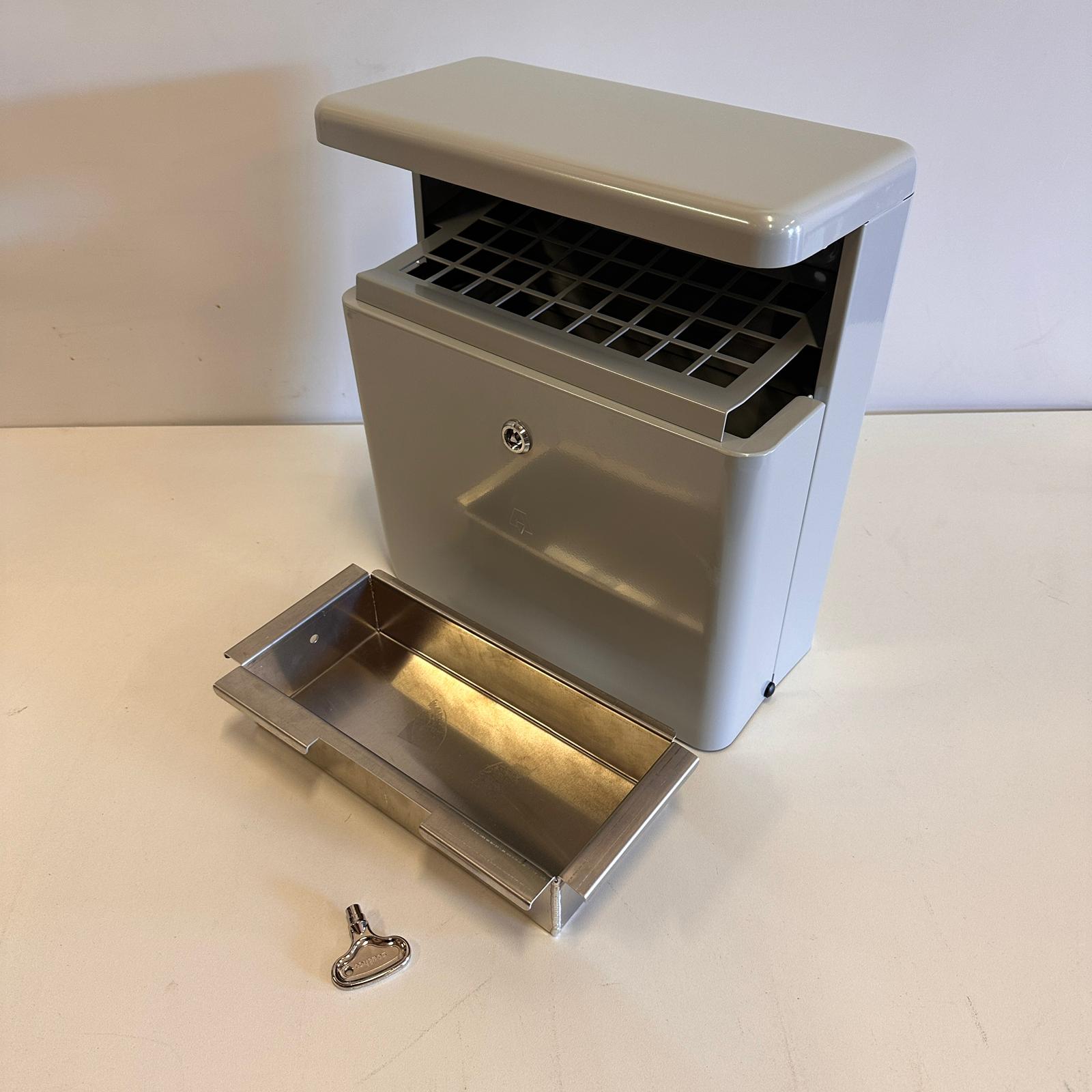 Een fraaie aluminium buitenasbak voor montage aan de wand of tegen een paal. Deze asbak heeft een handige frontinworp. De buitenasbak is voorzien van een afdak, wat inregenen voorkomt. De asbak heeft een uitneembare binnenbak zodat de asbak gemakkelijk te ledigen en te reinigen is.