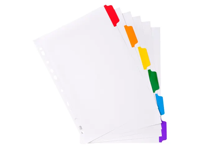 Tabbladen karton 160g – geplastificeerde gekleurde tabs + index – 6 tabs – A4 Verstevigd inhoudsblad dat gratis te bedrukken is met Kreaman® op www.exacompta.com Perforaties en verstevigde, veelkleurige Protect’o tabs FSC gecertificeerd, verantwoord beheer van de bossen.