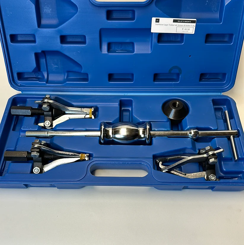 Bestaat uit 1 x trekker 125 mm trekdiepte, 1x glijammer 910 gram, lengte 285 mm en 5 hulpstukken voor het trekken van binnenlagers in grootte 8 tot 34 mm. 3 adapter voor het trekken van M6 x 1,0 – M8 x 1,25 – M10 x 1,5.