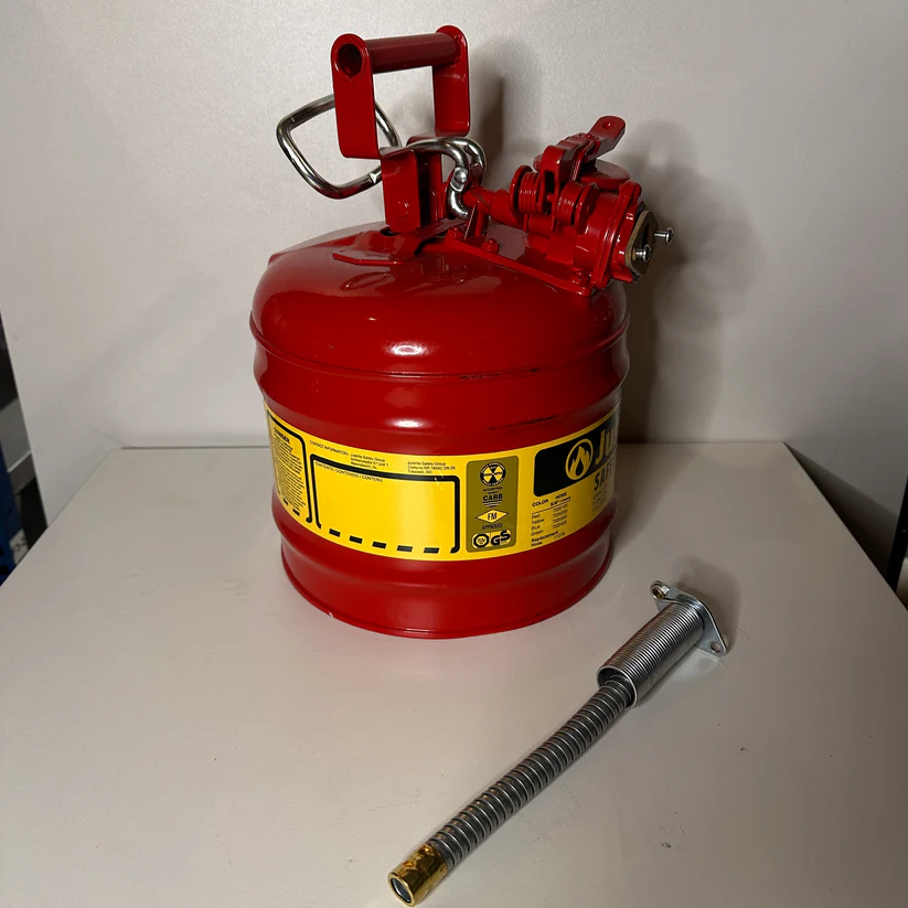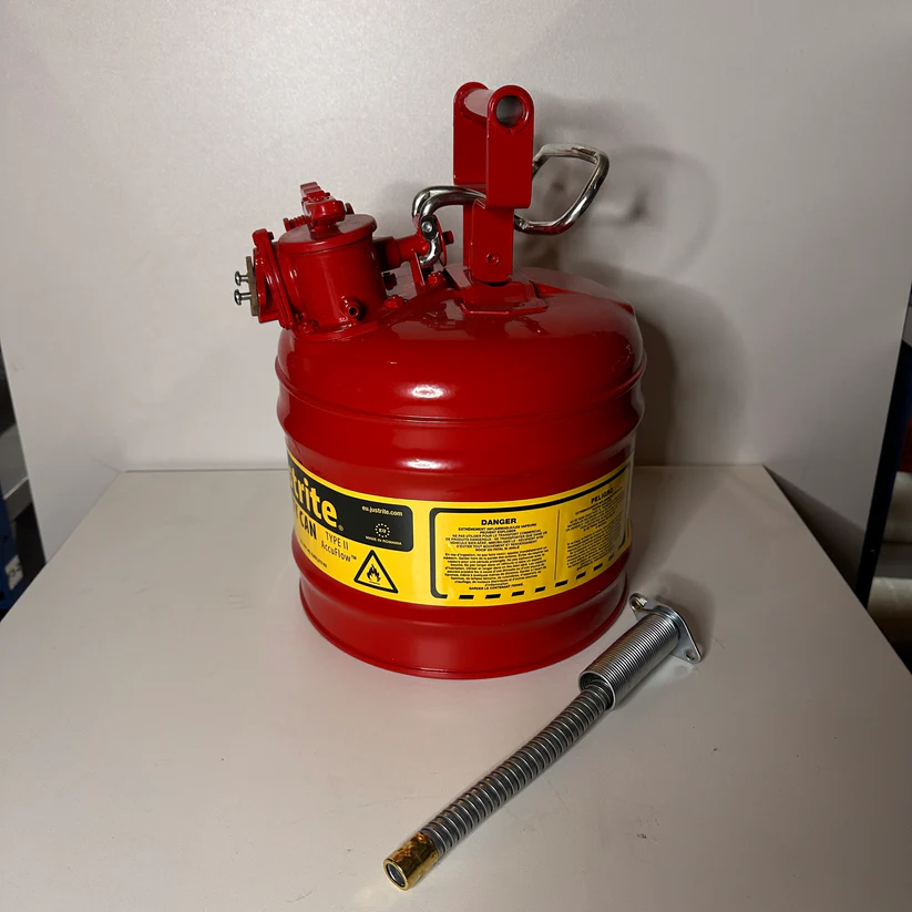 - Veiligheidskan met flexibele metalen slang voor controle van de vloeistoftoevoer in alle veiligheid.