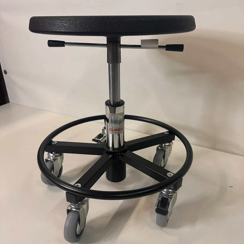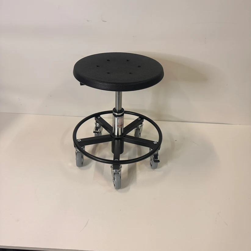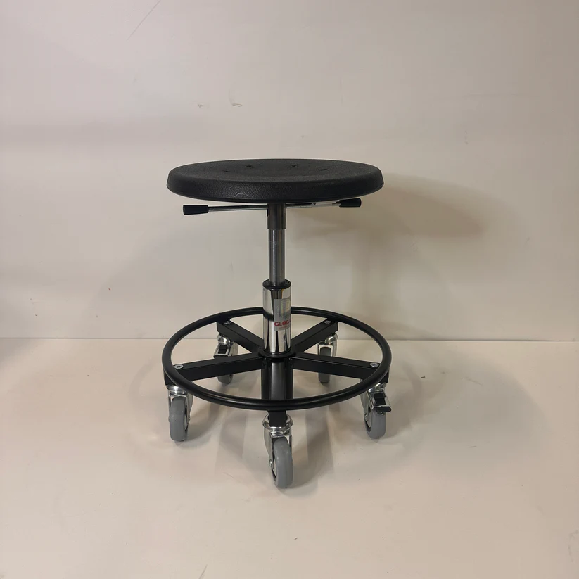 - Werkkruk met stalen basis met voetensteun en zitting van polyurethaan, kunststof, gelakt hout of gevoerd met schuimrubber.